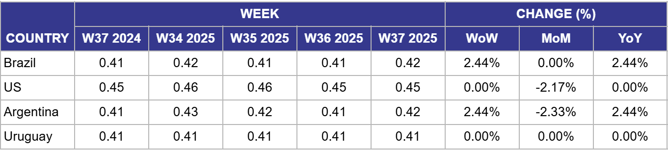 In Uruguay, the price of soybeans was USD 0.41/kg in W37, holding stable across WoW, MoM, and YoY comparisons. This stability reflects a market that has fully absorbed recent positive news without significant volatility. While reports confirmed that Uruguay, like Argentina, is a beneficiary of China's strategic diversification of suppliers, its market is much smaller, and the impact is more about long-term potential than an immediate price shock. The market appears to be in a state of equilibrium, supported by the prospect of increased Chinese demand but anchored by the large regional supply from Brazil and the broader global price environment. This stability suggests that while the long-term demand outlook has improved, current prices are considered balanced.