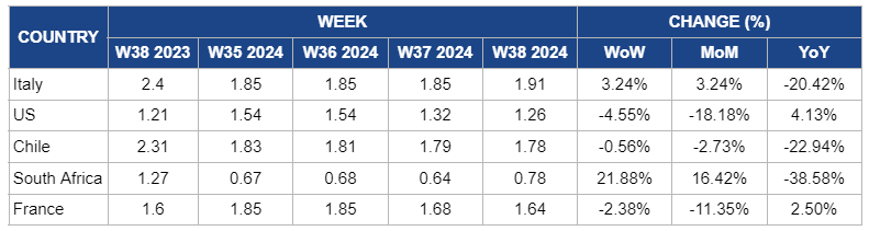 In W38, Chile's apple prices decreased slightly by 0.56% WoW to USD 1.78/kg. Additionally, there is a 2.73% MoM decline and a 22.94% YoY decrease. This trend is due to the continued easing of production limitations and improved weather conditions, contributing to a gradual market stabilization. The slight price reduction reflects ongoing adjustments as producers balance supply levels with steady demand. The YoY decline is due to the elevated price base from last year when production challenges led to higher prices. Overall, the market is progressively finding equilibrium as conditions stabilize.