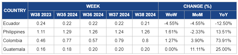 In the Philippines, banana prices increased slightly by 1.61% WoW to USD 1.26/kg in W38, with a 13.51% YoY rise. This is due to continued recovery efforts following earlier weather disruptions, which helped stabilize production, though ongoing supply limitations still support higher prices compared to last year. However, prices saw a 2.33% MoM decrease due to temporary improvements in supply as the rainy weather in W38 enhanced crop yields, easing some of the production challenges from previous months.