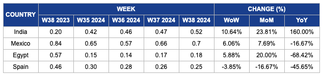 In W38, Spanish onion prices fell to USD 0.25/kg, reflecting a 3.85% WoW decrease, 16.67% MoM decline, and a 45.65% YoY drop. This sustained price decline is due to a combination of weak demand and excess supply, making it challenging for local exporters to remain competitive internationally. The 2024 season saw a substantial increase in onion planting. High stocks across other European markets, including the Netherlands and Germany, worsened the situation. The glut from early harvests and higher yields has created a temporary oversupply, pushing prices to significantly lower levels compared to the previous year.