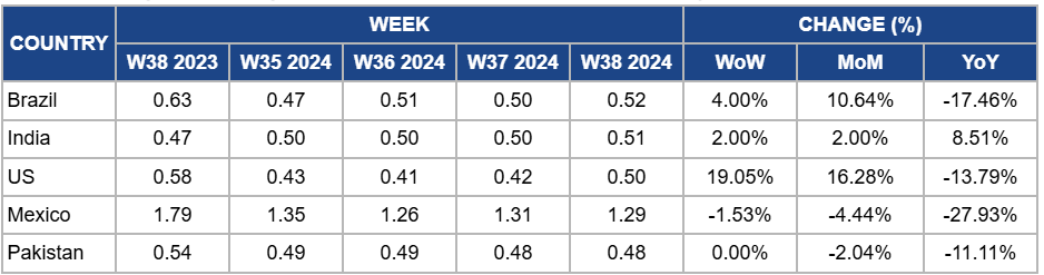 Mexico's sugar prices decreased by 1.53% WoW to USD 1.29/kg in W38, resulting in a 4.44% MoM and a 27.93% YoY drop. The YoY decline is attributed to a significant increase in domestic sugar production. In addition, the weakening of the Mexican peso against the US dollar also contributed to this price reduction in international markets. However, given the current production challenges in Brazil and Thailand, Mexico's price will likely recover in the short term.
