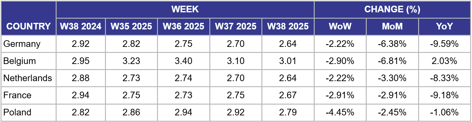 In France, the price of SMP was USD 2.67/kg in W38, falling 2.91% WoW and 2.91% MoM, which pushed the YoY comparison to a 9.18% drop. After a minor bounce last week, the French market has resumed its sharp decline, aligning with the bearish trend across Western Europe. The identical WoW and MoM decreases highlight the rapid pace of the recent downturn. This price weakness is being driven by the dominant negative sentiment across the continent, stemming from the collapse in butter prices and high dairy commodity stocks.