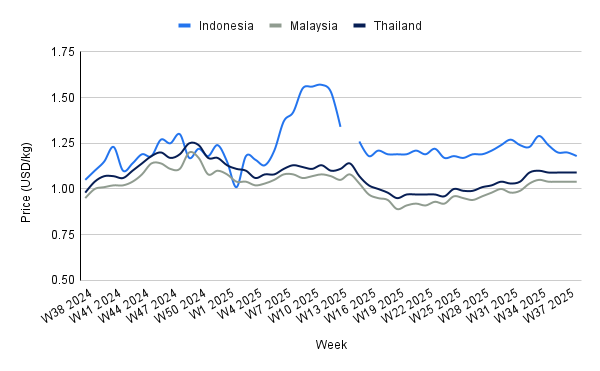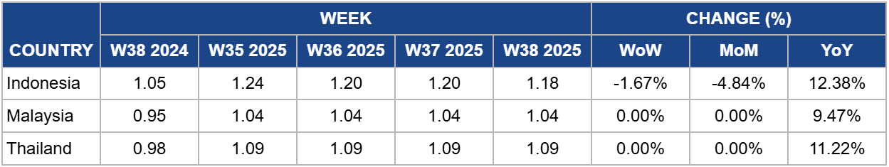 Thailand’s palm oil prices remained stable at USD 1.09/kg in W38, unchanged WoW and MoM, while rising 11.22% YoY from USD 0.98/kg. Price stability reflects bearish regional sentiment driven by high inventory levels in Malaysia, which constrain export opportunities and cap regional price movements. The stagnation suggests that Thailand's prices have fully accounted for current supply pressures. Nonetheless, the YoY increase underscores a stronger fundamental pricing environment for vegetable oils in 2025, indicating potential support for future price stability if regional demand strengthens or inventories ease.