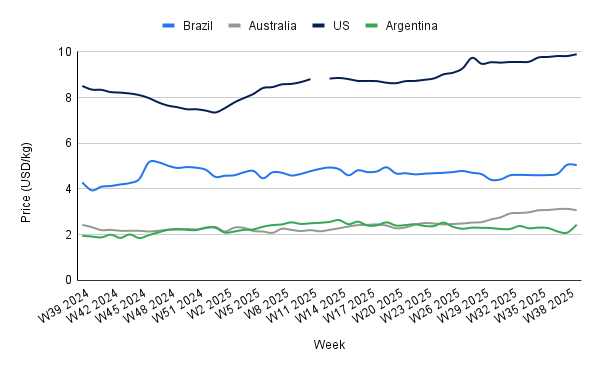 In W39, Argentina’s beef prices rose 6.55% WoW to USD 2.44/kg, a rise of 25.13% YoY, reflecting strong structural demand and a recovering domestic market. Per capita consumption reached 49.8 kg in Aug-25, up 4.2% YoY, supported by improved household purchasing power and slower inflation, which fell to 34.6%, the lowest since Dec-20. Between Jan-25 and Aug-25, apparent beef consumption increased 7.7% YoY to 1.56 mmt, while retail beef price gains remained moderate at 1.0% month-on-month (MoM). The combination of resilient demand and contained retail inflation supports continued price stability, with potential for further moderate increases if consumption growth persists.