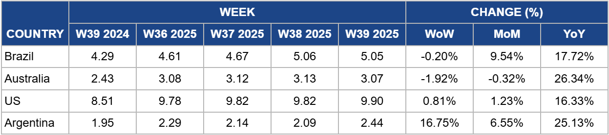 In W39, Brazil’s boneless rear beef prices slightly declined by 0.20% week-on-week (WoW) to USD 5.05/kg, though they remain 17.72% higher than last year, reflecting continued strong market support. Most domestic cattle markets also recorded small declines per arroba (15 kg), with São Paulo at USD 56.21 (-1.64%), Goiás and Minas Gerais at USD 53.40 (-1.72%), and Mato Grosso at USD 55.27 (-1.67%), while Mato Grosso do Sul saw a modest increase to USD 60.89 (+0.62%). Wholesale cuts followed this trend, with rear quarters falling 3.11% to USD 4.37/kg (BRL 23.35/kg) and forequarters down 2.78% to USD 3.28/kg (BRL 17.50/kg).