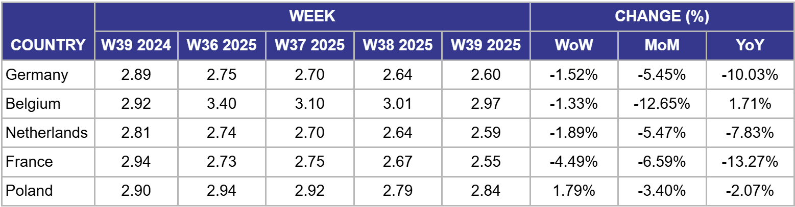 In the Netherlands, the price of SMP was USD 2.59/kg in W39, falling 1.89% WoW, 5.47% MoM, and 7.83% YoY. The Dutch market continues to track the broader negative trend affecting Northwestern Europe, with prices remaining under significant pressure. The decline across all measured periods is a clear result of the structural oversupply dominating the continent, as confirmed by reports of recovering EU milk production and a bearish market outlook. The consistent price weakness demonstrates that strong regional milk flows and muted buyer interest are the primary forces driving the market. The negative WoW, MoM, and YoY figures all point towards a market that is fundamentally oversupplied, with little prospect of short-term price support.
