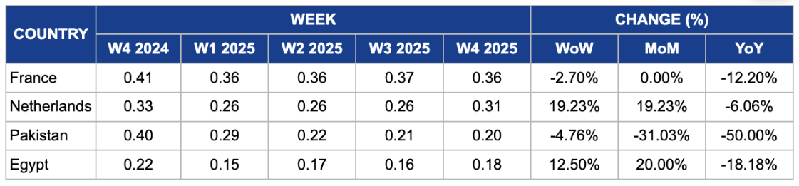 In the Netherlands, potato prices surged by 19.23% WoW and MoM to USD 0.33/kg in W4, driven by high exports and strong demand for Dutch potatoes. Currently, supply is limited, as many producers are holding potatoes in storage, anticipating higher prices in the coming weeks. Despite the price increase, YoY prices are down by 6.06%, reflecting a substantial rise in supply due to the 2024 harvest, which reached 7.6 million metric tons (mmt), a 16% increase compared to the average of the previous five years. However, demand continues to exceed the available supply on the market, as producers are holding back a portion of their stock.