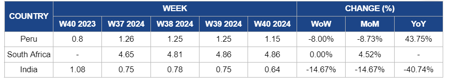 In Peru, grape prices decreased by 8% week-on-week (WoW) and 8.73% month-on-month (MoM) to USD 1.15/kg in W40 due to a temporary dip in demand as consumers adjusted to the new pricing levels following the resumption of exports to Ecuador. Despite the stable supply levels, this short-term price reduction reflects market fluctuations as producers adapt to changing dynamics. However, YoY prices increased significantly by 43.75% due to Peru's continued strong position as a global leader in grape production and the strong demand from domestic and international markets. This sustained growth is supported by high consumer interest in Peruvian grapes, particularly from primary producing regions such as Ica, Piura, Lambayeque, and La Libertad, despite cloudy weather conditions that may affect short-term supply.