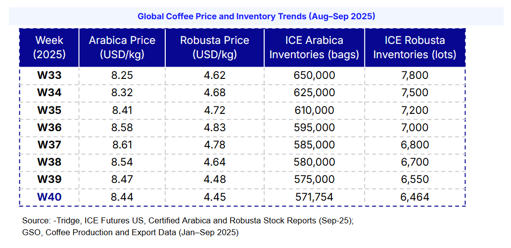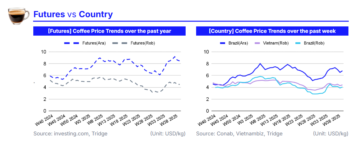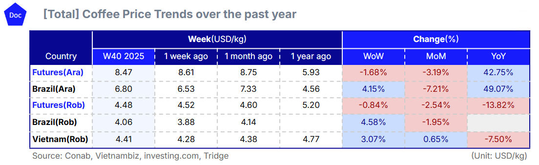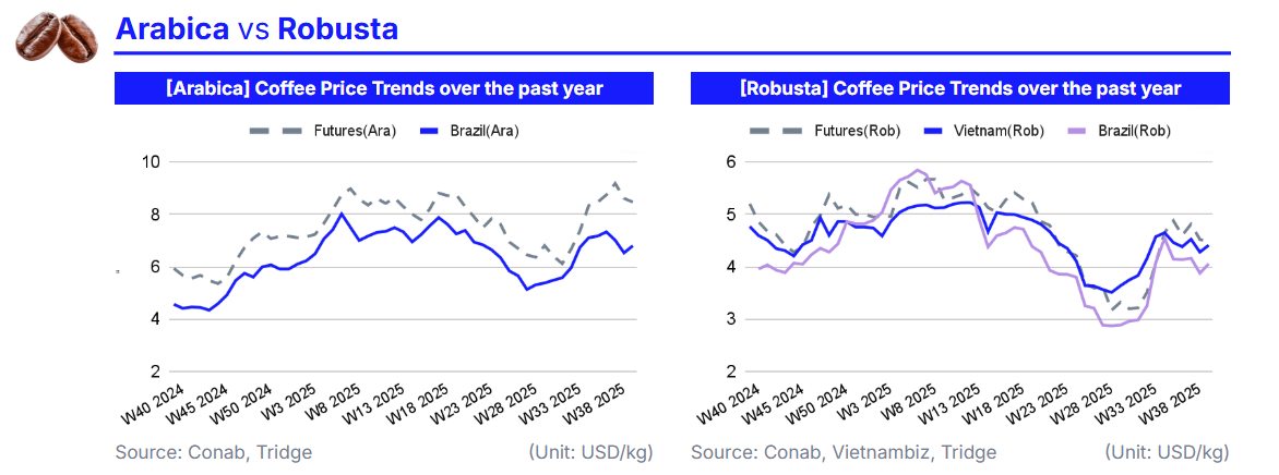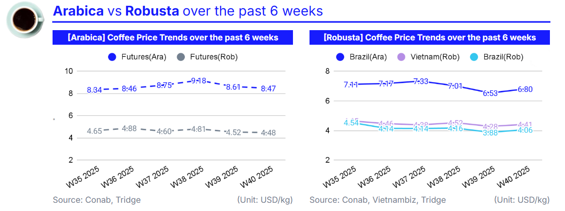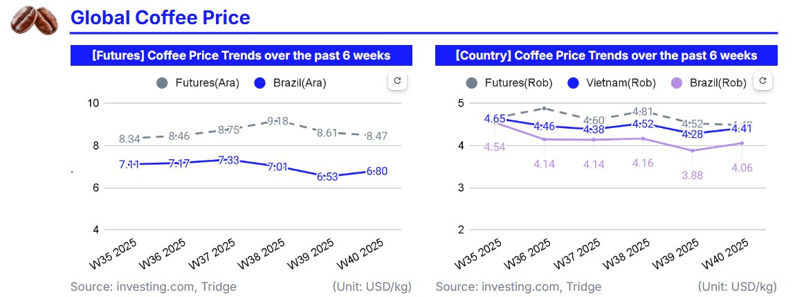 Driven by improved rainfall prospects in Brazil, the world’s largest coffee producer, and investor profit-taking after earlier rallies, global coffee prices showed mixed movements in W40 2025 compared to W39. The international Arabica price, represented by US Coffee C Futures, fell 1.68% WoW to USD 8.47/kg, while Robusta, represented by London Coffee Futures, declined 0.84% WoW to USD 4.48/kg amid long-position liquidations and easing weather concerns.