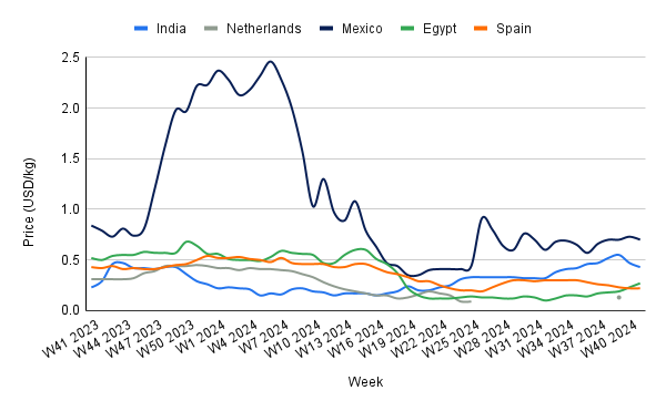 Egypt's onion wholesale prices rose significantly in W41, increasing by 17.39% WoW and 50% MoM to USD 0.27/kg. However, this represents a substantial YoY decline of 48.8% from USD 0.52/kg. The price rise follows the commencement of the Egyptian onion season in Apr-24, after a three-month export ban imposed due to last season's insufficient stocks, which had led to unprecedented local prices. Unfortunately, demand remains low, with producers reporting almost nonexistent interest in Egyptian onions, particularly from key markets like Saudi Arabia. This oversupply and diminished demand have led to falling prices compared to the previous season.