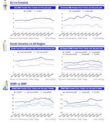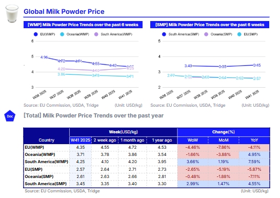 In W41, global milk powder markets reflected a bearish tone as prices declined across major exporting regions except South America. EU WMP and SMP prices fell due to weak regional demand and subdued export activity, while Oceania also recorded declines driven by strong production ahead of the spring flush. In contrast, South America saw price gains supported by steady demand and rising export activity, particularly from Argentina. With global milk output remaining high and inventories gradually building, market conditions continue to pressure EU and Oceania exporters, prompting the need for strategic responses such as targeting emerging markets, adopting flexible pricing strategies, and diversifying into higher-value dairy derivatives to maintain competitiveness.
