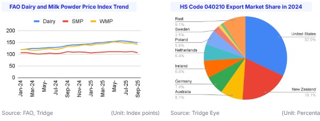 According to the Food and Agriculture Organization (FAO), the global dairy price index declined by 2.63% month-on-month (MoM) in Sep-25, reaching 148.26 points. Specifically, SMP prices dropped 4.28% MoM to 106.02 points, while WMP decreased by 3.09% to 141.22 points. The decline was largely driven by weaker demand from major importers and increased competition among exporters. This trend is consistent with the latest fortnightly held event, Global Dairy Trade (GDT) auction on October 7, where SMP prices fell by 0.5% to USD 2,599 per metric tons (mt), and WMP declined by 2.3% to USD 3,696/mt. Given this environment, the milk powder market outlook remains bearish, as global production stays high while demand remains sluggish.