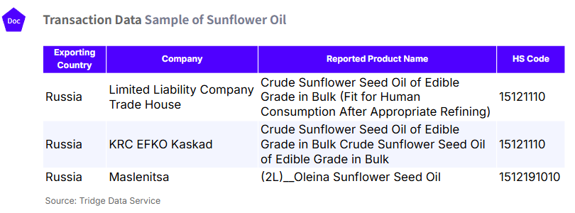 For global buyers and importers of sunflower oil, Russia presents a strategic sourcing opportunity, primarily driven by its significant price advantage and a strong harvest forecast. At USD 1,190/mt, Russia's FOB price is the most competitive among the major producers analyzed, offering a substantial discount compared to Ukrainian and particularly European supplies, which have been inflated by adverse weather conditions. With a favorable production outlook, Russia is well-positioned to increase its export volumes, especially to key demand centers like India, ensuring a more stable and available supply stream in the coming months. This combination of lower cost and higher volume makes Russia an attractive option for buyers. Tridge Eye’s transaction level data highlights Limited Liability Company Trade House, KRC EFKO Kaskad, and Maslenitsa as viable export partners in Russia.