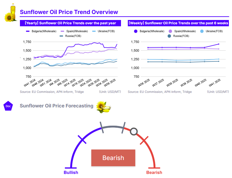 In W41 of 2025, global sunflower oil prices were primarily driven by weather-related supply concerns in the Black Sea region. Heavy rains in Ukraine delayed its harvest, causing a sharp 2.03% week-on-week (WoW) price increase, while the effects of a summer drought spurred a 6.11% price surge in Bulgaria. In contrast, Russia’s prices remained more stable due to a stronger harvest outlook, offering the most competitive export price at USD 1,190/mt. On an annual basis, prices are up significantly across all analyzed regions—ranging from 15% to 29%—highlighting market tightness from supply issues, especially in the Black Sea region. For buyers, Russia emerges as a key sourcing option due to its price competitiveness and expected large harvest. However, importers must balance this opportunity with careful management of the associated geopolitical and logistical risks to ensure supply chain stability.