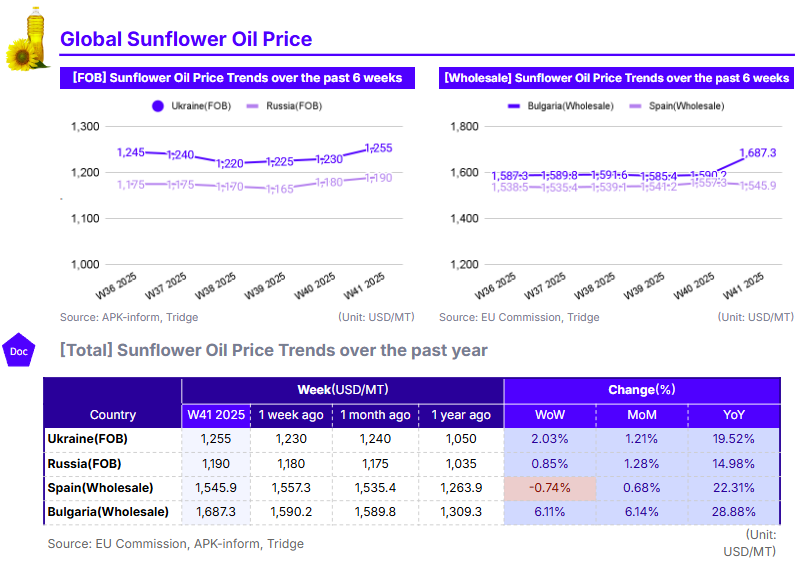 In W41 of 2025, sunflower oil prices showed mixed but predominantly upward movement, largely driven by adverse weather in key Black Sea producing regions. In Ukraine, the Free on Board (FOB) price for sunflower oil was USD 1,255 per metric ton (mt), a notable 2.03% increase WoW. Similarly, Bulgaria saw a significant wholesale price surge of 6.11% WoW to USD 1,687.3/mt. In contrast, Russia’s FOB price saw a more moderate increase of 0.85% WoW to USD 1,190/mt, while Spain’s wholesale price decreased slightly by 0.74% WoW.