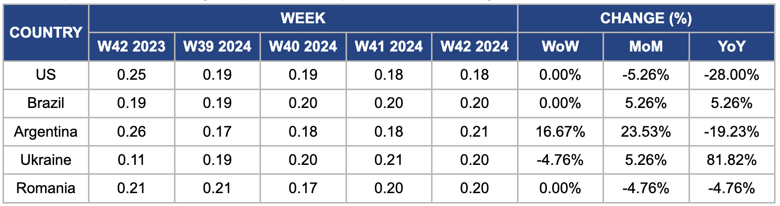 In W42, Romanian maize wholesale prices stood at USD 0.20/kg, marking a decrease of 4.76% MoM and YoY. Despite this decline, Romania, Europe’s second-largest grain exporter, is contending with a notable reduction in corn harvests due to one of the most severe droughts in decades. Nearly 2 million hectares of farmland are impacted, with corn output projected to decrease by 10 to 15% for the Oct-24 to Sep-25 season. This anticipated reduction is raising concerns about tighter supply and potential market disruptions in the coming months.