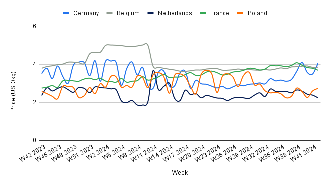 France's milk prices decreased to USD 3.69/kg in W42, marking a 2.64% WoW decline and a significant 6.58% month-on-month (MoM) drop. While milk supply in France and across Europe is recovering after earlier disruptions caused by unfavorable weather and the bluetongue virus, prices are still elevated, reflecting ongoing supply challenges. Despite the recent decline, prices remain 34.18% higher YoY, up from USD 2.75/kg, underscoring the lingering effects of production constraints and sustained strong demand compared to the abundant supply conditions in 2023.