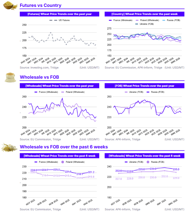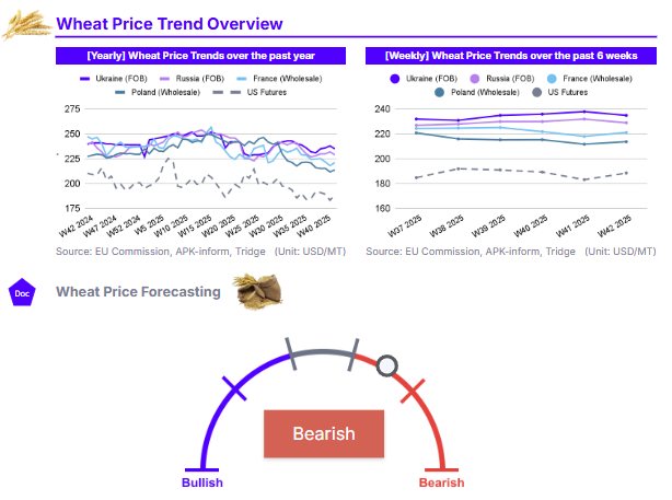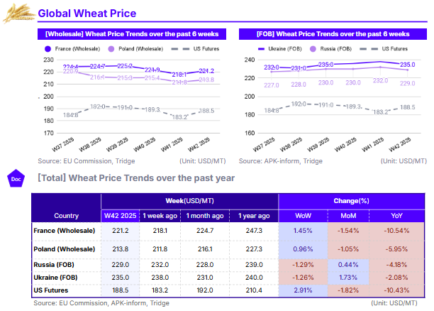 In W42, long-term price trends show significant downward pressure compared to the previous year across all major markets. In the US, Wheat Futures stood at USD 188.5/mt, down 1.82% month-on-month (MoM) and 10.43% YoY. This bearish trend was mirrored in France, where wholesale prices were USD 221.2/mt, reflecting a 1.54% MoM and 10.54% YoY decline. Poland’s price was USD 213.8/mt, down 1.05% MoM and 5.95% YoY. Even the Black Sea, which saw recent monthly gains, remained down compared to last year. Russia's Free on Board (FOB) price was USD 229.0/mt (+0.44% MoM, -4.18% YoY), and Ukraine's FOB price was USD 235.0/mt (+1.73% MoM, -2.08% YoY).
