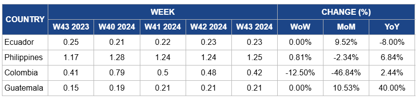 Banana prices in Guatemala remained stable at USD 0.21/kg in W43, with a 10.53% MoM increase and a 40% YoY rise due to sustained strong export demand from primary markets, particularly the US and Europe. This demand continues to support price levels despite previous weather-related disruptions. Additionally, improved weather conditions have further enhanced fruit quality and export readiness, enabling producers to meet ongoing demand effectively at higher prices. The price resilience also reflects the growing appeal of Guatemalan bananas in the international market, contributing to the overall positive trend.