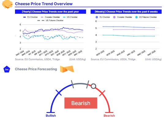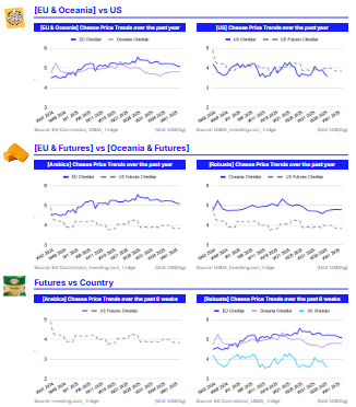 Given the current cheese market dynamics, EU processors, where prices remain stable in euro terms but under external downward pressure, should focus on enhancing export competitiveness through strategic exchange rate hedging and by expanding into price-sensitive emerging markets across Asia and the Middle East. In Oceania, where record milk solids and abundant supply continue to weigh on prices, processors can cushion further declines by channeling excess milk into higher-margin, value-added categories such as processed cheese, cream-based products, and long-shelf-life dairy powders. Meanwhile, US processors, contending with elevated inventories and weaker export competitiveness, should prioritize stock clearance through targeted retail promotions ahead of the holiday season, while pursuing strategic export partnerships in developing markets with growing demand for affordable dairy products.