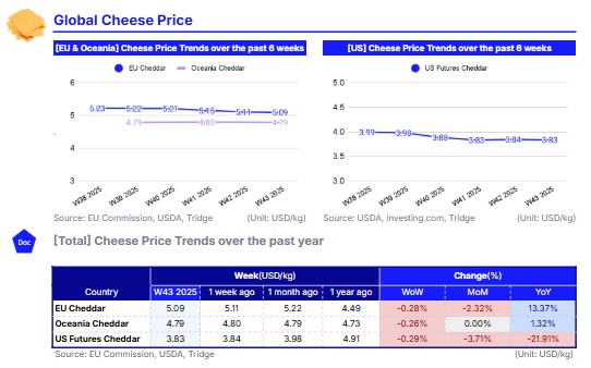 In W43, the global cheese market remained under pressure as strong milk production continued to exceed demand across key regions. In the EU, prices were steady in local terms but faced external downward pressure due to ample supply and limited export demand. Oceania saw downward trend, with record milk solids output in New Zealand sustaining strong supply levels, while the US market continued to grapple with high inventories and weak export competitiveness despite improving retail demand ahead of the holiday season. The October 21 GDT auction also reflected a soft market tone, driven by abundant milk output and subdued buying interest. On the demand side, China’s cheese imports increased in Sep-25, signaling growing consumer interest in value-added dairy products even amid broader market weakness. To adapt, processors are recommended to enhance export competitiveness, channel excess milk into higher-margin cheese and dairy categories, and expand into emerging markets in Asia and the Middle East to support global market balance.