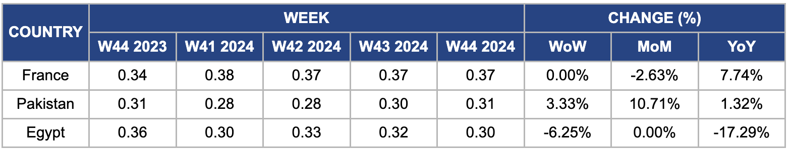 In W44, Egypt's wholesale potato prices fell to USD 0.30/kg, marking a 6.25% decrease in WoW from USD 0.32/kg in W43. This decline is attributed to the increased supply, coinciding with the onset of winter and the start of production for new crops. The market is seeing abundant production of vegetables such as potatoes, and prices are expected to decline as more winter crops flow into the markets gradually. This drop follows a sharp price increase in Aug-24 and Sep-24. Moreover, the prices have decreased 17.29% YoY, worsened by climate change and a prolonged shortage of US dollars, which has hindered the import of essential potato seeds. Economic challenges, including high inflation and currency depreciation, have further exacerbated the situation, reducing yields. Yields dropped from 14-16 mt per acre in 2023 to 9-12 mt per acre in 2024.