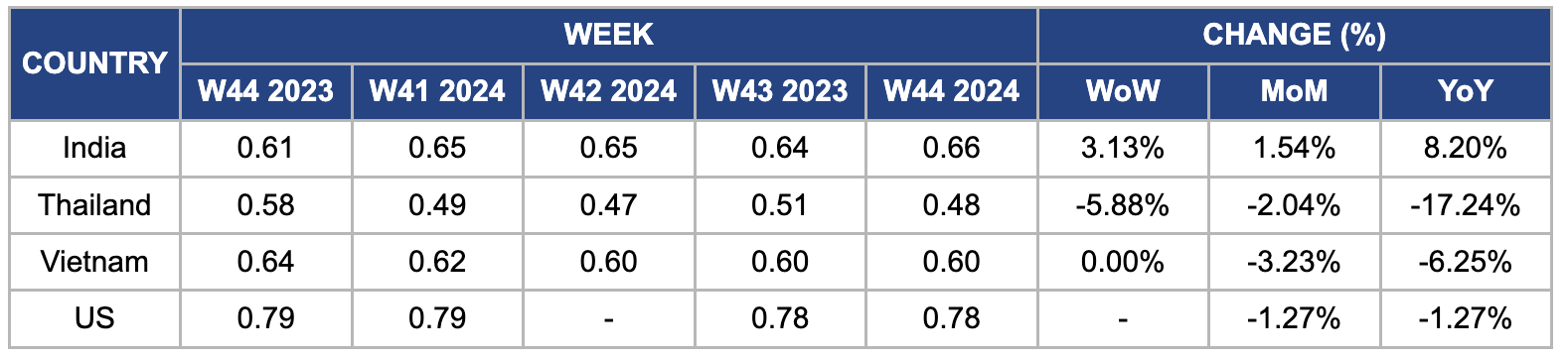 In W44, wholesale prices for Thai rice decreased by 5.88% WoW and 2.04% MoM, falling to USD 0.48/kg. This price drop can be attributed primarily to the increase in supply as the Thai harvest season progresses, leading to a greater volume of rice entering the market. Additionally, the current market conditions reflect softer demand, as buyers could hold back on purchases in anticipation of further price declines. Overall, the increased supply from the ongoing harvest and potential shifts in demand dynamics have decreased wholesale prices for Thai rice.