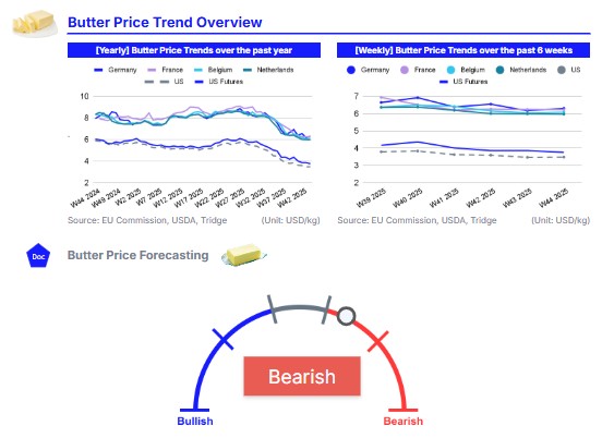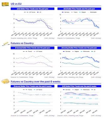 Given the persistent MoM and YoY declines in butter prices across Europe and the US, buyers and processors can take advantage of the lower price environment by securing long-term supply contracts with reliable producers in the EU, the US, and Oceania. This ensures stable access and reduces exposure to short-term volatility. Exporters in Europe and New Zealand should diversify their customer base beyond traditional Asian and Middle Eastern markets. They can target regions with stable but price-sensitive demand, such as North Asia, which accounted for 73% of butter purchases at the recent GDT event.