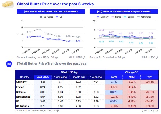 In W44, butter prices in Germany averaged USD 6.31 per kilogram (kg) up 2.17% week-on-week (WoW) but down 8.93% month-on-month (MoM) and 20.55% year-on-year (YoY). Belgian butter prices stood at USD 6.08/kg, a modest 0.62% WoW rise but remaining 6.45% MoM and 26.72% YoY lower. In contrast, French butter averaged USD 6.24/kg, a slight 0.12% WoW drop and a 4.34% MoM decline. However, when measured in euros, French prices were 0.15% higher WoW at EUR 538.01/100kg, highlighting the effect of currency fluctuations. Meanwhile, Dutch butter slipped 0.27% WoW to USD 5.97/kg, though prices remained stable in local terms at EUR 515.0/100kg.