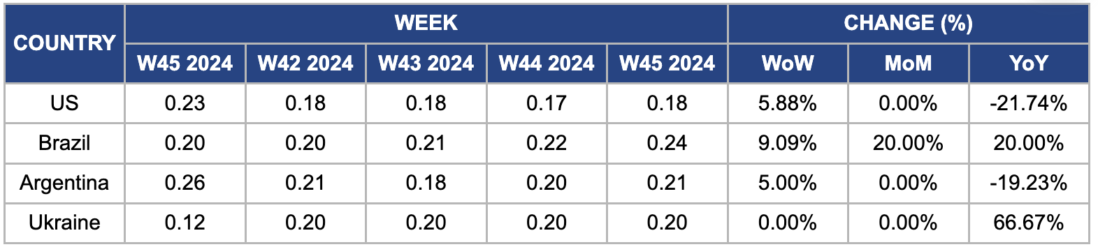 Ukrainian wholesale maize prices held steady WoW at USD 0.20/kg in W45, reflecting a substantial 66.67% YoY increase from USD 0.12/kg in 2023. The Ukrainian Agrarian Council (UAC) revised the USDA's forecast for Ukraine's corn harvest downward by 1 mmt to 26.2 mmt due to dry weather conditions, contributing to the price surge. Challenges persist as the country’s reliance on deep-sea ports has led to a 13% YoY decline in the once-significant export route through Constanta.