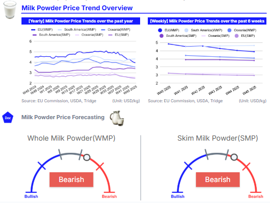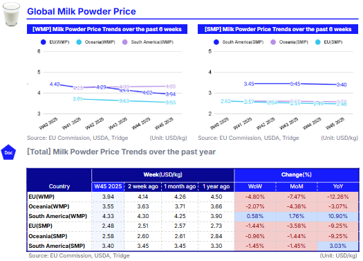 In W45, global milk powder markets remained generally subdued. In the EU, both WMP and SMP showed modest declines, supported by steady production and contract-driven demand, with limited spot market activity. Oceania experienced softer prices for WMP and SMP amid strong milk flows and easing domestic and export markets. In South America, WMP prices rose slightly on stable demand, while SMP declined as producers prioritized WMP drying during the spring flush. The global dairy price trend reflected weaker prices across major commodities, where WMP declined and SMP remained stable. US milk powders faced strong competition from lower-priced New Zealand and European products, while traditional buyers reduced purchases and Southeast Asian markets remained oversupplied. To navigate these conditions, EU and Oceania producers should optimize production schedules and strengthen long-term contracts. South American producers should balance cream and skim outputs to maximize returns. Meanwhile, US stakeholders should focus on product differentiation, exploring alternative markets, and employing currency hedging strategies to protect market share and margins.