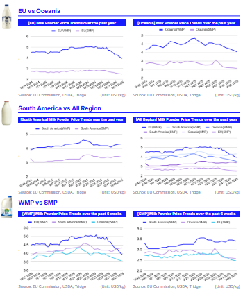 In Oceania, WMP prices averaged USD 3.55/kg, down 2.07% WoW, 4.38% MoM, and 3.07% YoY. Production remained active, supported by strong milk flows, while both domestic and export prices softened. SMP prices also eased slightly to USD 2.58/kg, down 0.96% WoW, 1.44% MoM, and 9.25% YoY, with production steady due to ample milk availability for drying.