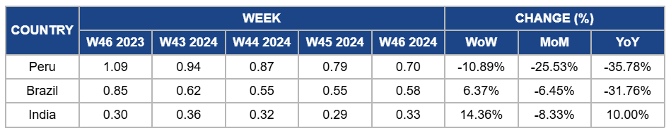 Mango prices in India in W46 rose by 14.33% WoW, reaching USD 0.33/kg. This represents a 10% YoY increase. The increase in WoW and YoY prices is due to improved quality and a steady rise in demand as the winter harvest season begins, particularly in regions producing late-season varieties. However, MoM prices dropped by 8.33% due to the ongoing stabilization of the market after the initial seasonal price adjustment. Stable weather conditions in W46 supported harvesting activities, ensuring consistent supply to the market, which tempered further price surges.
