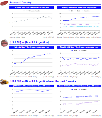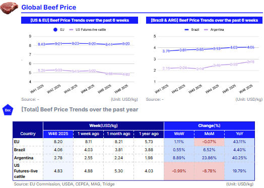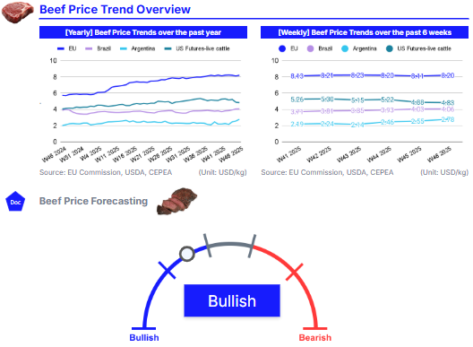 In W46, global beef markets remained tight, pushing prices higher. EU beef averaged USD 8.20/kg, up 1.11% WoW, supported by stable demand and supply constraints. Brazil and Argentina saw rises to USD 4.06/kg and USD 2.78/kg respectively, driven by strong seasonal consumption. US live cattle futures averaged USD 4.83/kg, slightly down WoW and MoM but 19.79% higher YoY, reflecting low domestic supplies. Earlier US tariffs on Brazilian beef had intensified price pressures, but the recent removal of the 40% tariff is expected to ease supply constraints and reduce retail costs. In Europe, the EU introduced a safeguard under Mercosur to protect domestic farmers, though enforcement concerns remain. Importers and processors are recommended to diversify sourcing and use forward purchasing strategies. Meanwhile, Brazilian and Argentine exporters can leverage strong domestic and international demand to optimize production and market access.