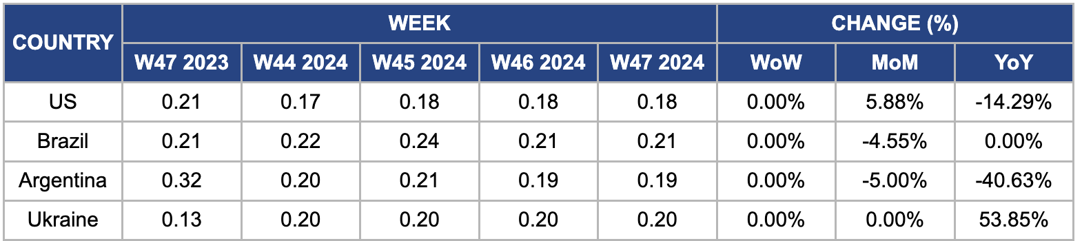 In W47, wholesale maize prices in the US remained stable week-on-week (WoW) at USD 0.18 per kilogram (kg) but increased 5.88% MoM. The Nov-24 World Agricultural Supply and Demand Estimates (WASDE) report forecasted lower production and ending stocks for the 2024/25 US corn season. Corn production is projected at 15.1 billion bushels, a decrease of 60 million bushels from the previous month, with a yield reduction to 183.1 bushels per acre. The harvested area remains unchanged at 82.7 million acres. Total use is forecasted to remain at 15 billion bushels, resulting in lower ending stocks of 1.9 billion bushels.