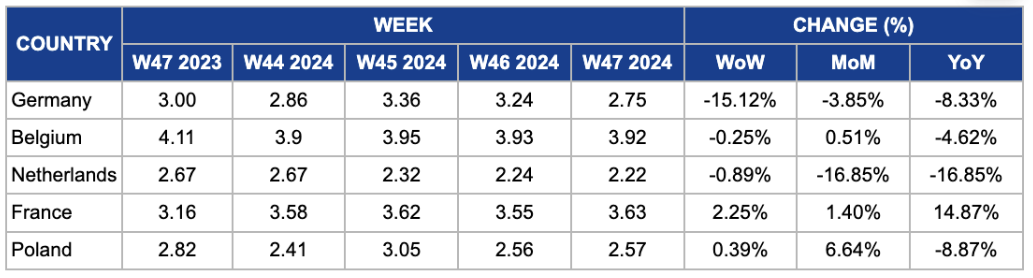 In Belgium, the milk price remained relatively stable, with a slight decrease of 0.25% WoW and a moderate increase of 0.51% MoM. However, YoY prices dropped by 4.62% to USD 3.92/kg in W47. This relative price stability in Belgium contrasts with other European markets, reflecting the strength of Belgium's dairy sector. The country's milk production has been consistently supported by productivity improvements, which have helped maintain stable output levels. Strong global demand due to supply constraints might cause price increases in Belgium as the market might face pressure due to demand surpassing supply.