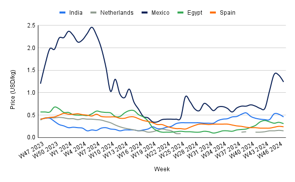 In W47, Mexico's onion prices decreased to USD 1.24/kg, marking a 10.79% WoW decline. However, prices increased 19.23% MoM from USD 1.04/kg. The National Institute of Statistics and Geography (INEGI) reported a rise in the National Consumer Price Index (INPC), with inflation at 4.56% in the first half of Nov-24. Non-core price index, which includes fruits and vegetables, rose by 1.44% biweekly and 7.64% annually. Onions increased 14.88% during this period, which reflects broader inflationary pressures in the country, particularly affecting food prices. Inflation and supply dynamics influence the rise in onion prices, suggesting continued volatility in the coming weeks.