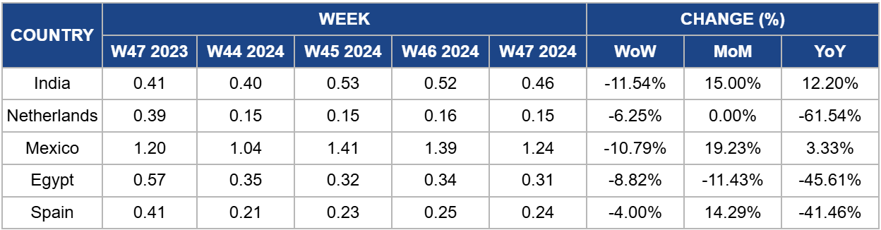 In the Netherlands, onion prices slightly increased to USD 0.15/kg in W47, reflecting a 6.25% decrease from the previous week but maintaining month-on-month (MoM) stability. Between Oct-24 and Nov-24, Dutch onion exports reached 39,292 mt, a rise of 13,000 mt compared to the previous year. While export volumes are below the peak in 2020 and 2021, they have been consistently within the 30,000 to 40,000 tons range, supported by stable pricing. Key markets such as Senegal, Ivory Coast, and Mali have been significant buyers, with Senegal continuing to be the largest importer. Despite a robust supply this year, including imports from neighboring countries, challenges remain with low stocks and lower-quality onions, which could affect pricing. The 2024 crop is projected to reach 1.3 mmt, similar to the 2021/22 season, but growers are advised to carefully manage their exports to avoid a potential backlog by year-end.