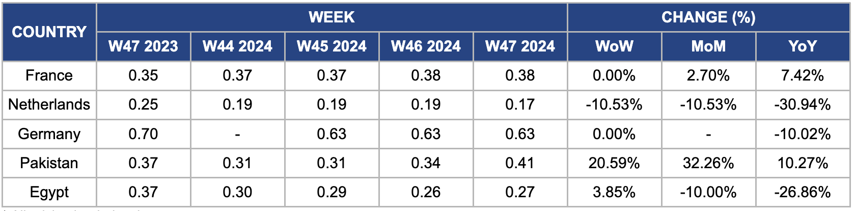 In W47, wholesale potato prices in France remained stable week-on-week (WoW) at USD 0.38/kg but saw a 2.70% rise month-on-month (MoM) and a 7.42% YoY increase. This price surge can be due to several factors, including rising production costs, declining yields, and challenges like climate change, wireworms, and chemical bans. These issues resulted in the loss of 11 thousand ha of potato cultivation in the latest season. Moreover, heavy rainfall during the harvest season downgraded yields and led to discarding large quantities of potatoes. With 97% of the harvest completed from a record 177 thousand ha, France's potato supply was further constrained, tightening the market.