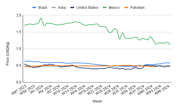 In W47, Mexico's sugar prices dropped to USD 1.12/kg, reflecting a 5.88% week-on-week (WoW) decrease and a 34.12% YoY decline from USD 1.70/kg. This price trend coincides with strengthened international collaboration in the sugar sector. Cuban and Mexican sugarcane research institutions formally agreed to exchange genetic and biological material to enhance sugarcane cultivation. The initiative aims to improve breeding practices, combat pests and diseases, and advance scientific research. These efforts align with broader discussions during the VIII Meeting of Sugar Technicians' Associations from both countries, where experts highlighted the need for innovative and efficient production methods to address global challenges like climate change and supply chain disruptions. These efforts may improve yields and lower costs in the long term, stabilizing prices. However, short-term volatility from weather and market factors remains likely.