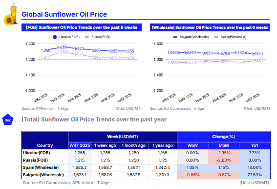 In W47 of 2025, sunflower oil export prices in the Black Sea remained stable, extending the stable period experienced in recent weeks. Ukraine's Free on Board (FOB) price held steady at USD 1,255 per metric ton (mt), unchanged week-on-week (WoW). Similarly, Russia's FOB price remained flat at USD 1,215/mt. In the European Union (EU) wholesale market, price movements diverged slightly. Spain recorded a 1.05% WoW increase to USD 1,585.2/mt, while Bulgaria saw a minor decline of 0.86% WoW to USD 1,673.1/mt.