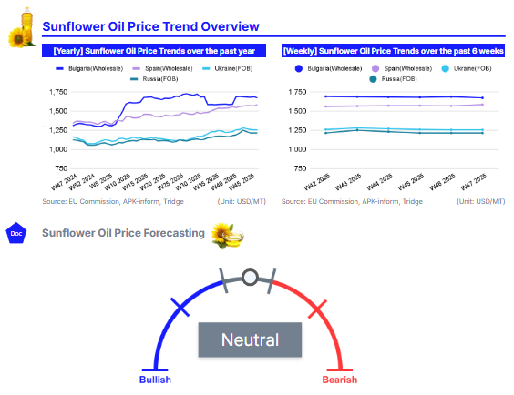 In W47 of 2025, global sunflower oil prices remained stable in the Black Sea region while showing mixed movement in the EU. Ukraine’s FOB price held at USD 1,255/mt, and Russia’s FOB price remained at USD 1,215/mt. EU wholesale markets diverged, with Spain rising 1.05% WoW to USD 1,585.2/mt and Bulgaria dipping 0.86% WoW to USD 1,673.1/mt. Despite weekly stability, the market remains structurally tight, with prices up significantly YoY: Bulgaria (+27.69%), Spain (+18.08%), Ukraine (+7.73%), and Russia (+8.00%). This bullish trend is underpinned by a decade-low harvest in Ukraine and the smallest EU crop in nine years. Russia remains the most cost-effective sourcing origin, though geopolitical and logistical risks persist. Tridge Eye’s transaction level data highlights Divo Altaya, Maslenitsa, and Yug Rusi as viable export partners in Russia.