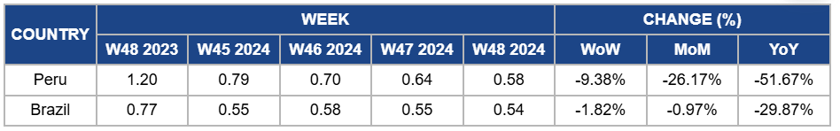 Peru's mango prices declined significantly by 9.38% week-on-week (WoW) to USD 0.58/kg in W48, a 26.17% month-on-month (MoM) decline and a 51.67% YoY decline. The price drop is due to the early start of the 2024/25 export campaign in the Ancash region, which led to a higher-than-expected supply. The favorable weather accelerated the harvest, contributing to an increased volume of mangoes reaching markets earlier than usual. Despite challenges posed by overlapping harvests from other regions like Piura, the overall supply boost put downward pressure on prices. Additionally, logistics improvements, such as the new Chancay Port, have supported the smooth flow of exports, but the surge in available mangoes led to price declines.