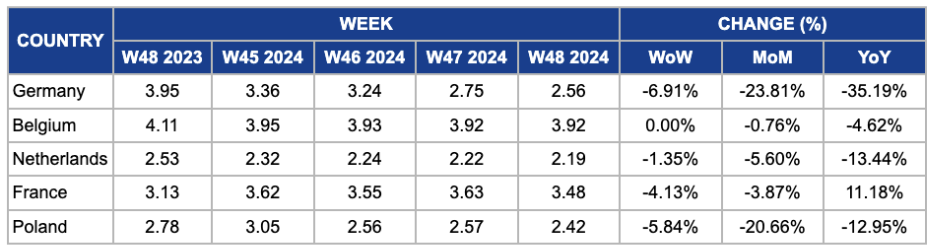 Milk prices in Belgium have been stable in recent weeks, with the price remaining unchanged at USD 3.92/kg in W48 compared to the previous week. There was a slight decrease of 0.76% MoM, while prices dropped by 4.62% YoY. The decline in YoY prices is more moderate than in some other European countries analyzed. Currently, supply in the Belgian market remains stable. Still, with supply and demand dynamics constrained and high milk supply in other European markets, prices in Belgium could rise as demand may shift towards their milk.