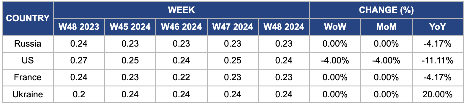 In W48, French wheat prices dropped by 4.17% YoY, reaching USD 0.23/kg from USD 0.24/kg. This decline is due to a stronger euro and increased competition from the Black Sea region, where recent tenders from Tunisia and Algeria favored competitively priced Russian wheat. The depreciation of the ruble has benefited Russian exporters. Additionally, poor harvest conditions in France, including heavy rainfall that negatively impacted crop quality and yields, have contributed to the price drop. Strained diplomatic relations with Algeria, aggravated by France's recognition of Morocco's sovereignty over Western Sahara, have further reduced Algeria's wheat imports from France.