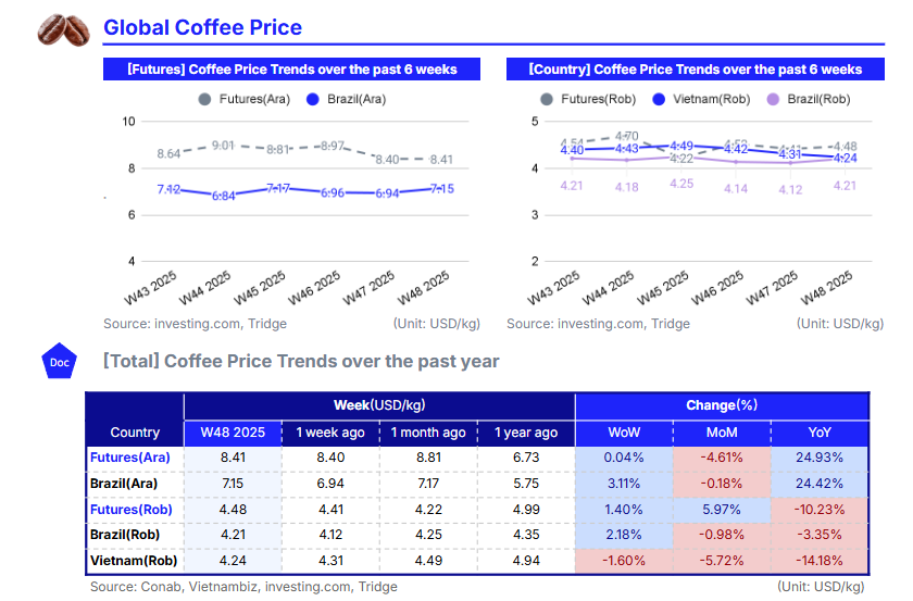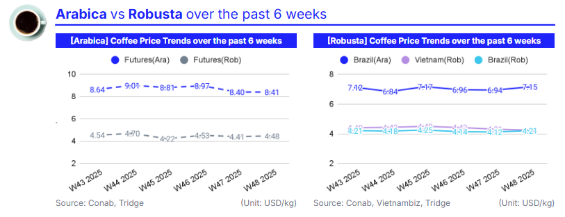 In W48 2025, global coffee prices entered a period of adjustment as markets responded to the removal of the United States (US) tariffs on Brazilian coffee and continued weather-driven uncertainty in Brazil and Vietnam. The international Arabica benchmark, represented by US Coffee C Futures, rose 0.04% week-on-week (WoW) to USD 8.41/kg, while Robusta, represented by London Coffee Futures, increased by 1.40% WoW to USD 4.48/kg, reflecting cautious recovery after sharp declines earlier in the month. The suspension of the additional 40% US tariff restored predictability to US–Brazil trade flows, reducing costs for US buyers and improving competitiveness for Brazilian exporters. However, the announcement initially triggered steep declines in New York and London futures before concerns over irregular rainfall in Brazil revived upward pressure. Weather instability in Minas Gerais continued to threaten the development of the 2026 crop, supporting firmer prices during the final sessions of Nov-25.
