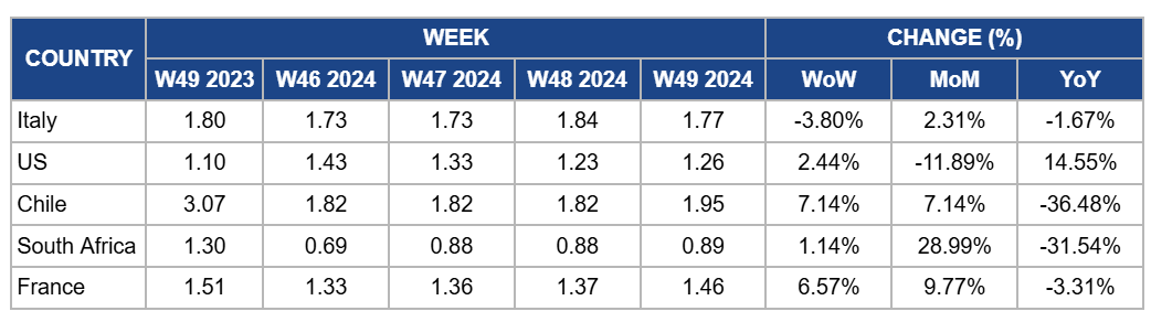 In Italy, apple prices dropped by 3.80% week-on-week (WoW) to USD 1.77/kg in W49, with a 1.67% year-on-year (YoY) drop. The price drop is due to the continued adjustment of supply levels following the peak harvest period, leading to increased availability of apples in the market. However, there is a 2.31% month-on-month (MoM) price increase due to the shift toward holiday-driven demand, which has boosted consumption of locally produced apples. This seasonal increase in demand and reduced competition from other regions have supported a modest price uptick compared to the previous month.