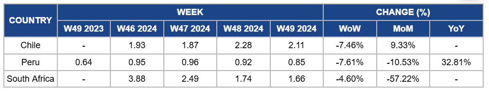 In W49 in the grape landscape, despite the challenges of weather and disease, the grape harvest shows promise in Brazil's Rio Grande do Sul. Healthy vine development and careful pest management contributed to this positive outlook. Meanwhile, Chile began its table grape exports, focusing on quality to meet strong demand in the US and Europe. A new export strategy has been implemented to help the country maintain a competitive edge in these markets. The grape industry faces significant difficulties in India due to fluctuating weather conditions. This led to a sharp decline in Muscat Hamburg grape production in Theni, which prompted calls for government intervention. Despite similar weather challenges, Nashik's grape exports started, with early shipments reaching destinations like Russia and the UAE, highlighting the region's resilience. On the other hand, South Africa is facing proposed EU changes regarding maximum residue levels. These changes could result in reduced export yields, increased production costs, and potential shifts in market dynamics. As for weekly pricing, grape prices in Chile declined due to increased supply as the country ramps up its export season, with market pressure from growing volumes. In Peru, prices dropped due to the post-harvest adjustment and normalized supply, although strong US and European export demand has supported higher YoY prices. South Africa's grape prices slightly dropped, influenced by a high supply during the peak harvest season, increased competition, and an oversupply in export markets.
