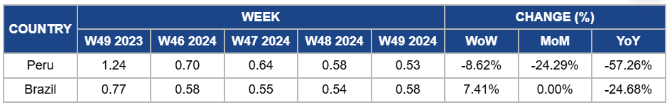 Peru's mango prices have continued to decrease, with a week-on-week (WoW) drop of 8.62% in W49, reaching USD 0.53 per kilogram (kg). There is also a 24.29% month-on-month (MoM) decline and a 57.26% year-on-year (YoY) drop. Despite challenges such as lower production and smaller fruit sizes caused by irrigation shortages in the Piura region, prices have remained under pressure due to oversupply in key export markets and weak demand. The increase in Brazilian mango exports to Europe has intensified competition, making it difficult for Peruvian farmers to maintain price levels. Additionally, the Kent variety continues to dominate exports, while less common varieties like Edward and Ataulfo face limited demand. Logistical issues and an overall oversupply in export markets have exacerbated the price decline.