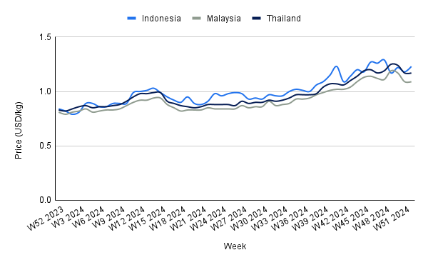 Indonesia's palm oil prices increased to USD 1.23 per kilogram (kg) in W52, marking a 4.24% week-on-week (WoW) rise and a significant 40.48% year-on-year (YoY) increase. This upward trend is driven by tightening inventories despite higher production, exports, and domestic consumption. In Oct-24, palm oil production grew by 9.69% to 4.843 million metric tons (mmt), exports surged by 19.33% to 2.543 mmt, and domestic consumption rose by 4.73% to 2.083 mmt. However, ending stocks decreased by 4.61% to 2.502 mmt, reflecting ongoing supply constraints.